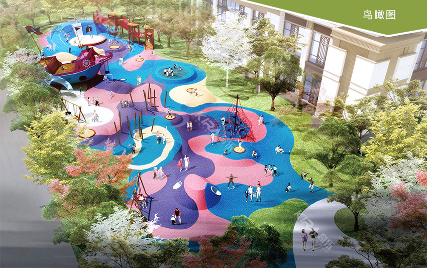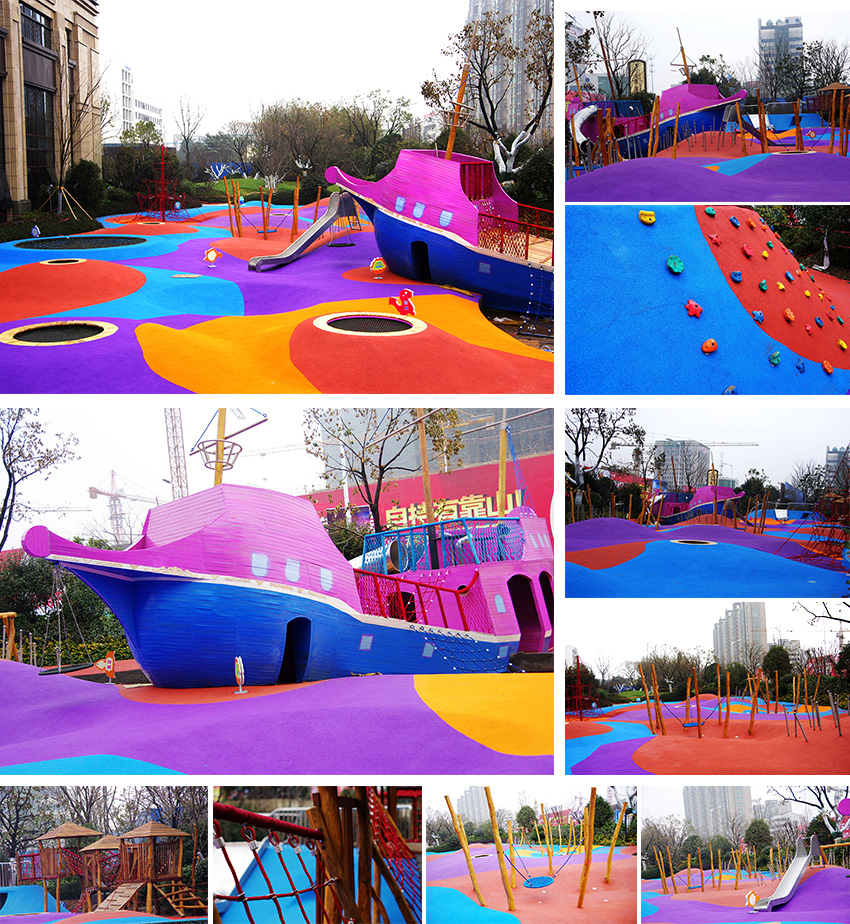 整個場地平面用五彩的橡膠地墊鋪設(shè)而成,俯瞰就像陽光照射下的波光粼粼的浪花一般奪人眼球,橡膠地墊為材料的高低起伏的地形既讓孩子充分感受攀山越嶺的快樂又能完好的保護孩子的安全。
